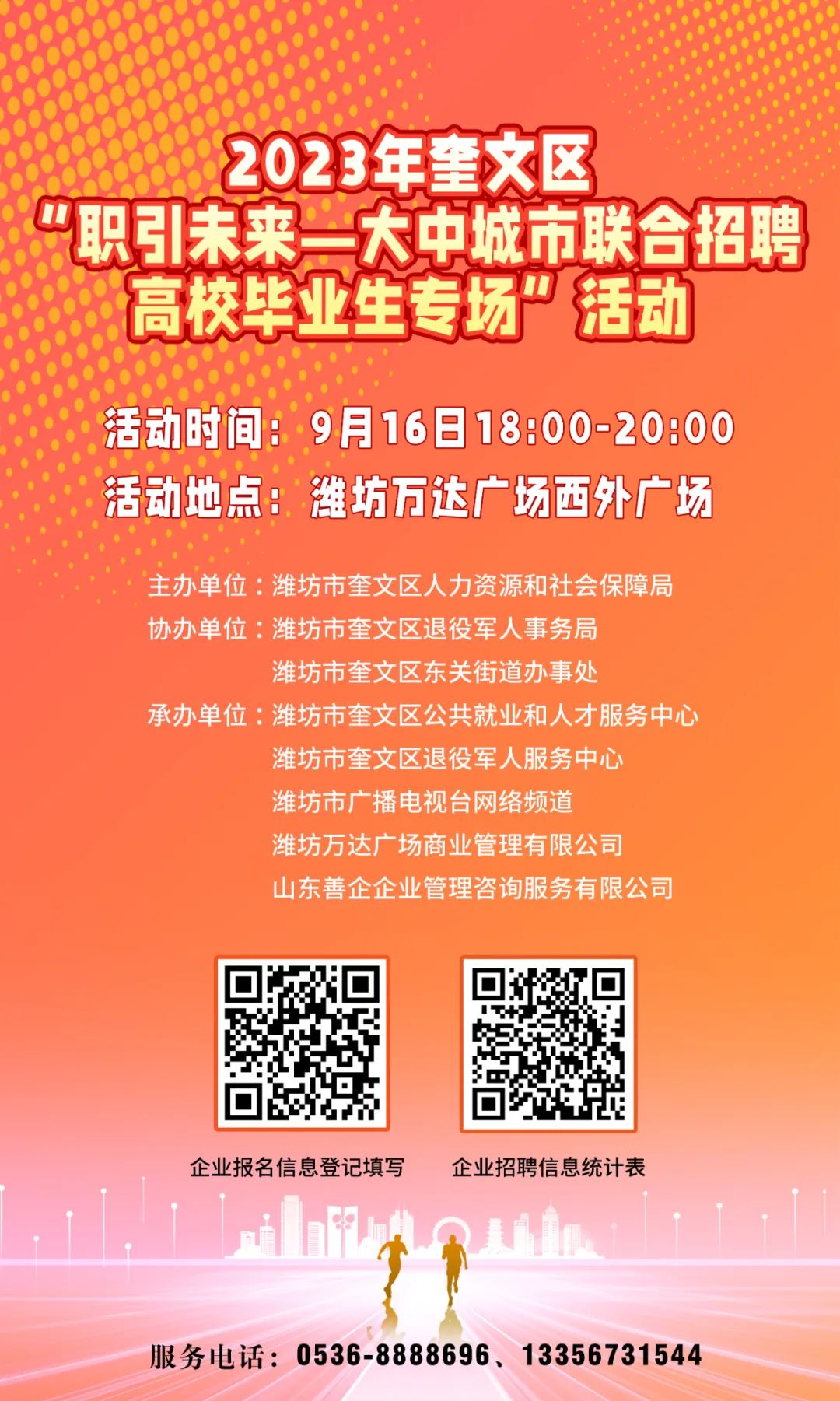 举办2023年奎文区“职引未来—大中城市联合招聘高校毕业生专场”活动,欢迎用人单位和求职者积极参加。本系列活动公益化服务,不收取任何费用,名额有限,请广大企业扫描海报二维码报名。