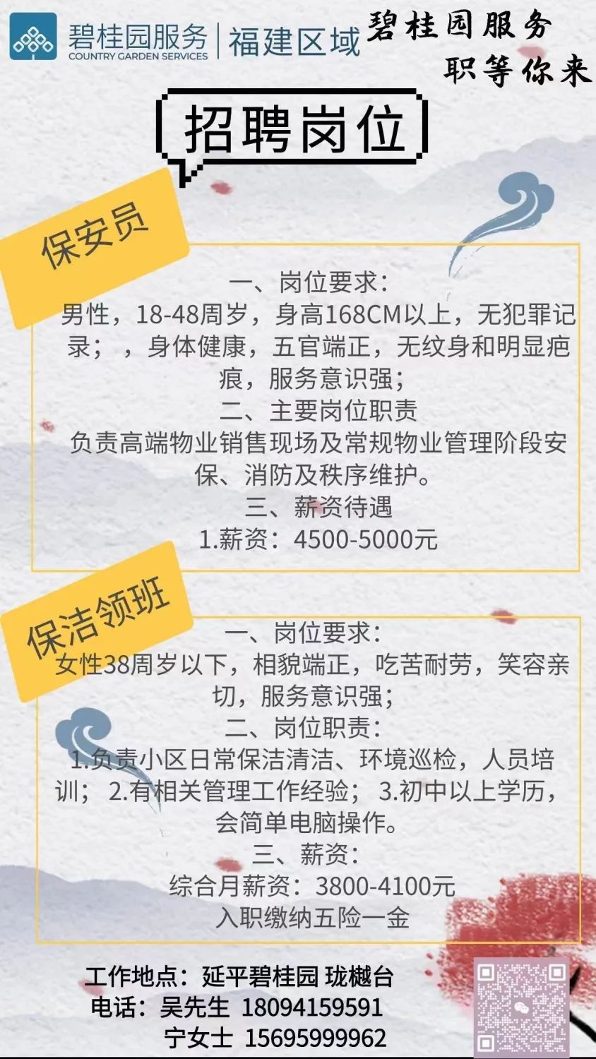(长按二维码查看详情)▼【保安员 保洁领班】3800-5000元 招聘人数:若干