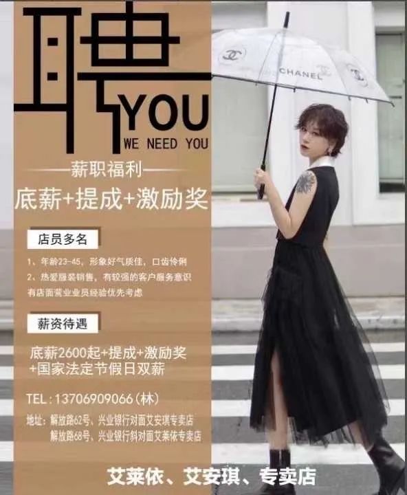 职位描述:招聘:店长、导购员 年龄25—45 工资面议 底薪+双抽+奖励 (艾安琪)品牌女装欢迎您的加入[拥抱][拥抱][拥抱] 电话:15859902804微信同号[嘴唇][嘴唇][嘴唇]
