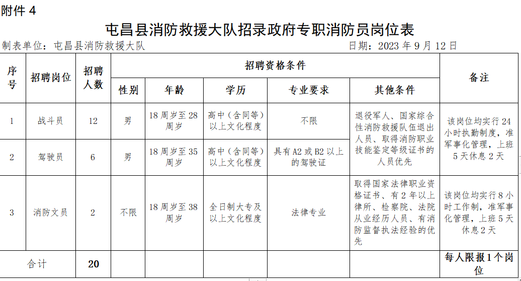 4.《2023年屯昌县消防救援大队招录政府专职消 防员岗位表