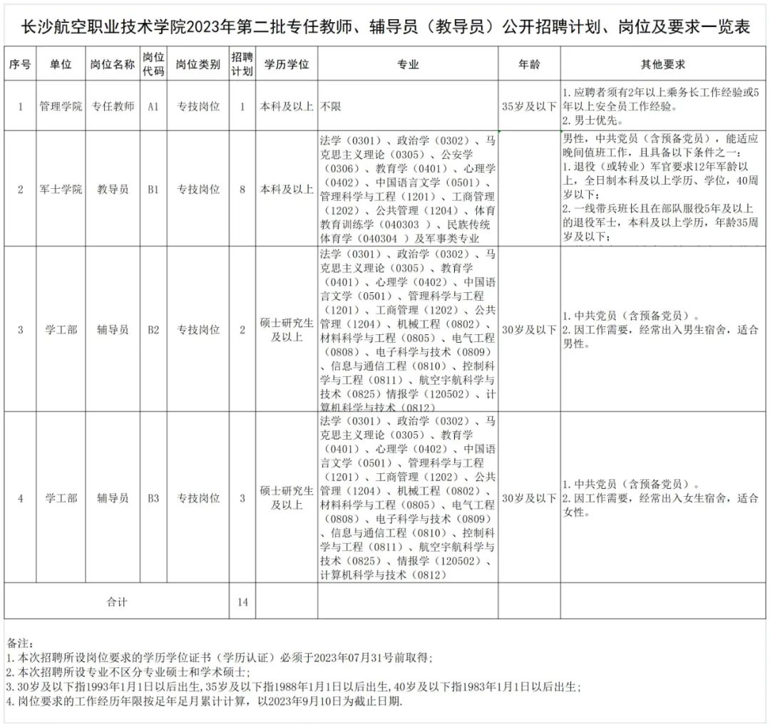 附件:1.长沙航空职业技术学院2023年第二批专任教师、辅导员(教导员)公开招聘计划、岗位及要求一览表