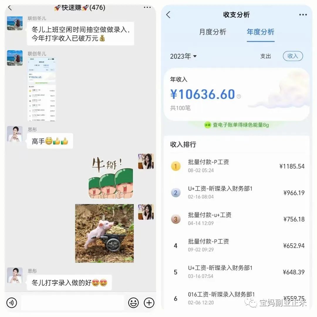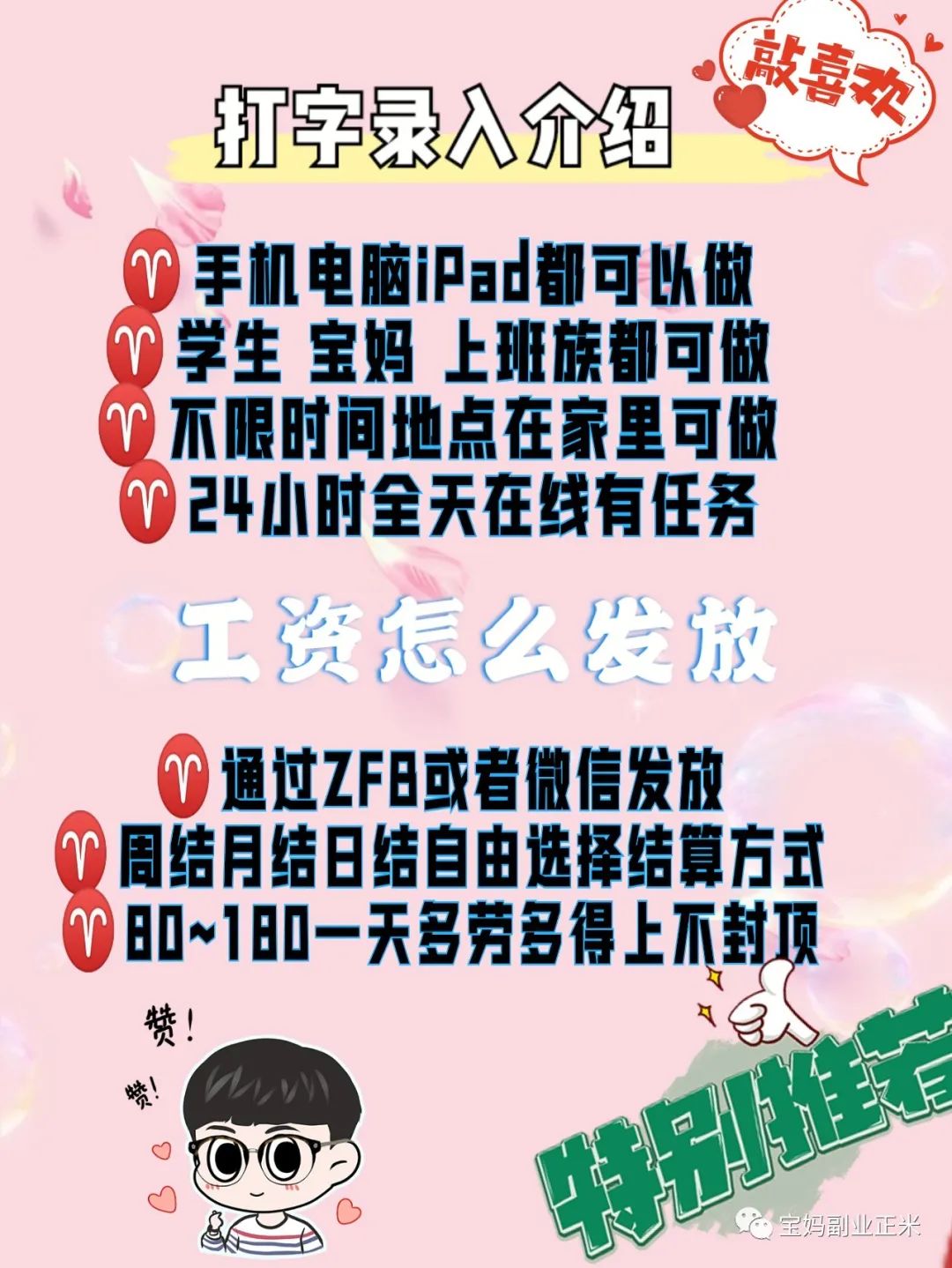 然而全职带娃没有合适的工作,副业成为我们的首选,居家工作一部手机 一台电脑,随时可做,不耽误陪孩子,同时还可以转小金库,本工作适合在校学生、宝妈、上班族等等,抽出看抖音的时间来做做录入,存下自己的小金库,何不是一件快乐的事呢!