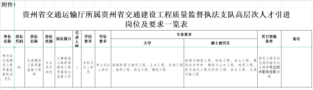 具体引进岗位及要求见《贵州省交通运输厅所属贵州省交通建设工程质量监督执法支队高层次人才引进岗位及要求一览表》(附件1)。