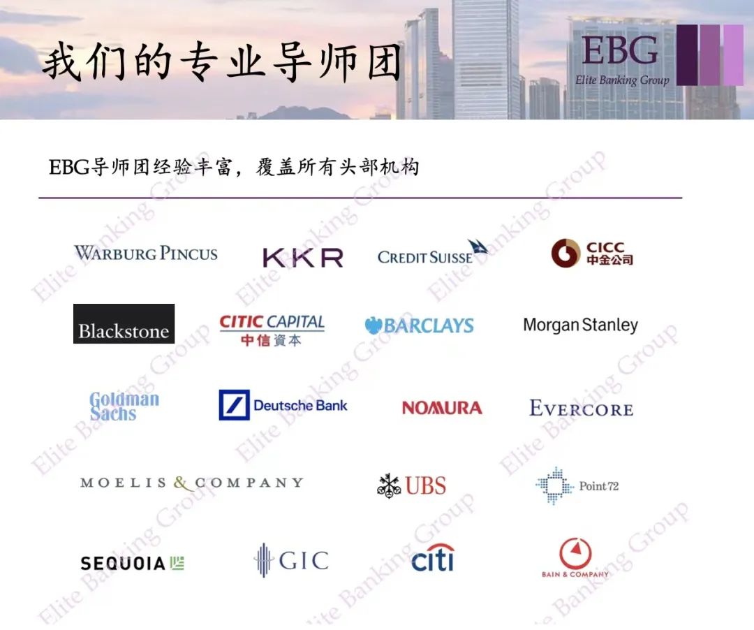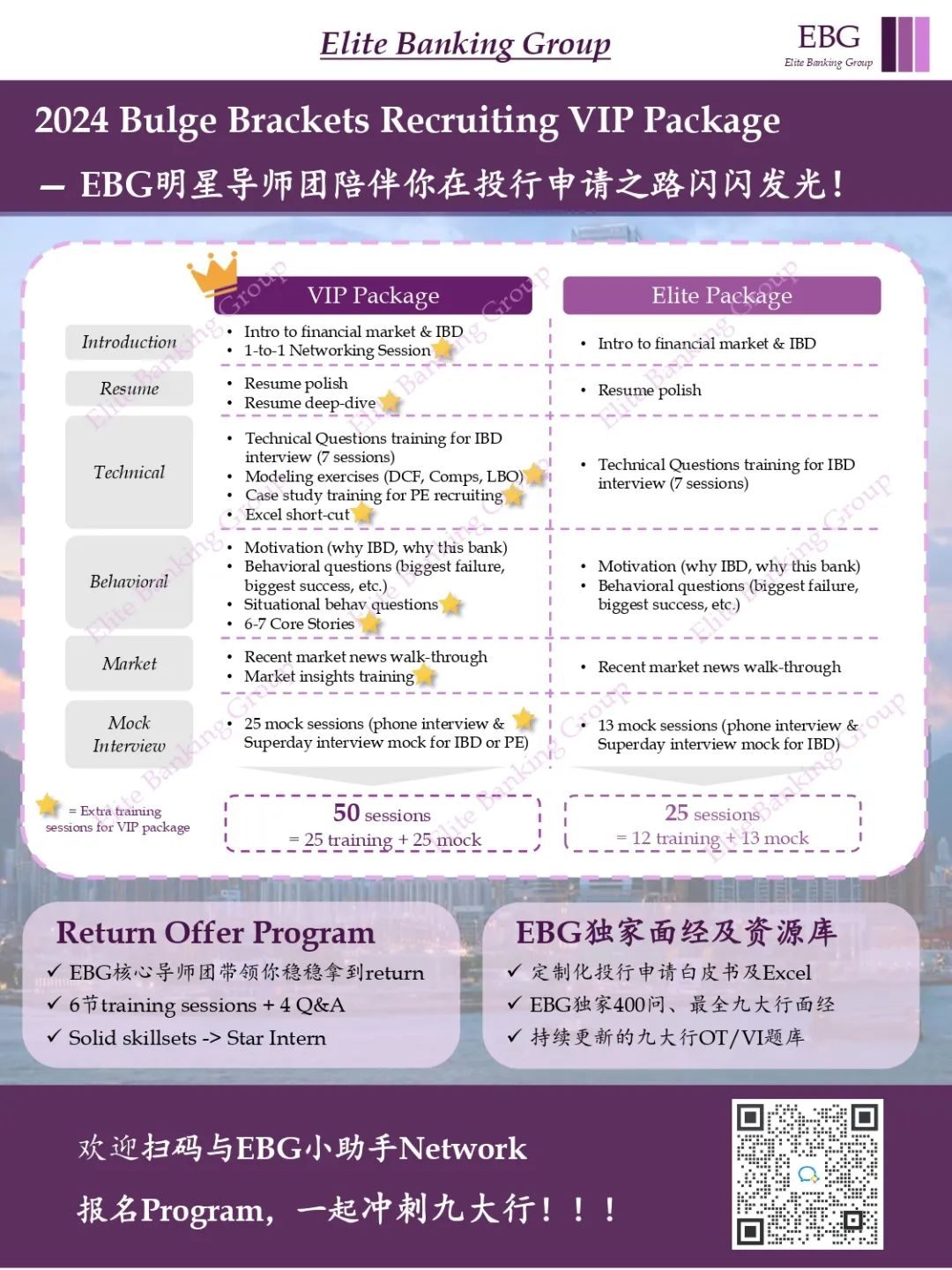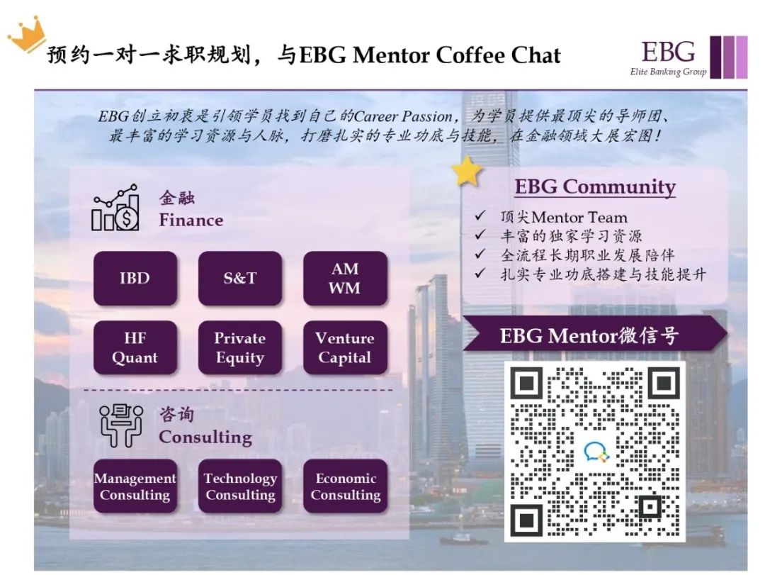 EBG VIP Program会为申请IBD的学员匹配核心导师团,通过高效的1v1授课模式快速掌握IBD的technical,通过定期举办的行业讲座理解how to share a recent market news / a recent deal and personal insights,通过全流程的独家资料掌握一手信息并有针对性的准备面试。感兴趣报名的小伙伴欢迎扫描文末二维码与EBG导师network!