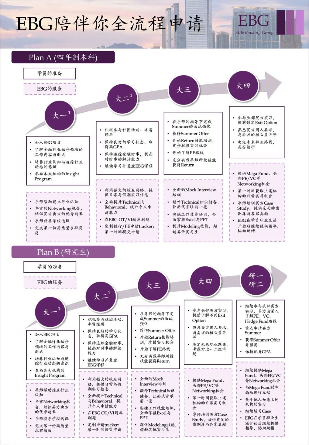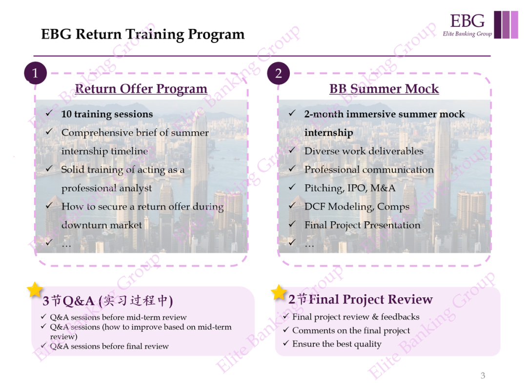 为帮助同学们战胜今年激烈竞争的Summer,EBG为大家准备了由8年中资+外资行经验的Staffer VP坐镇,多为熟悉欧美与亚太资本市场的资深Asso指导,全面覆盖Summer时间线与工作内容的Return Training Program。