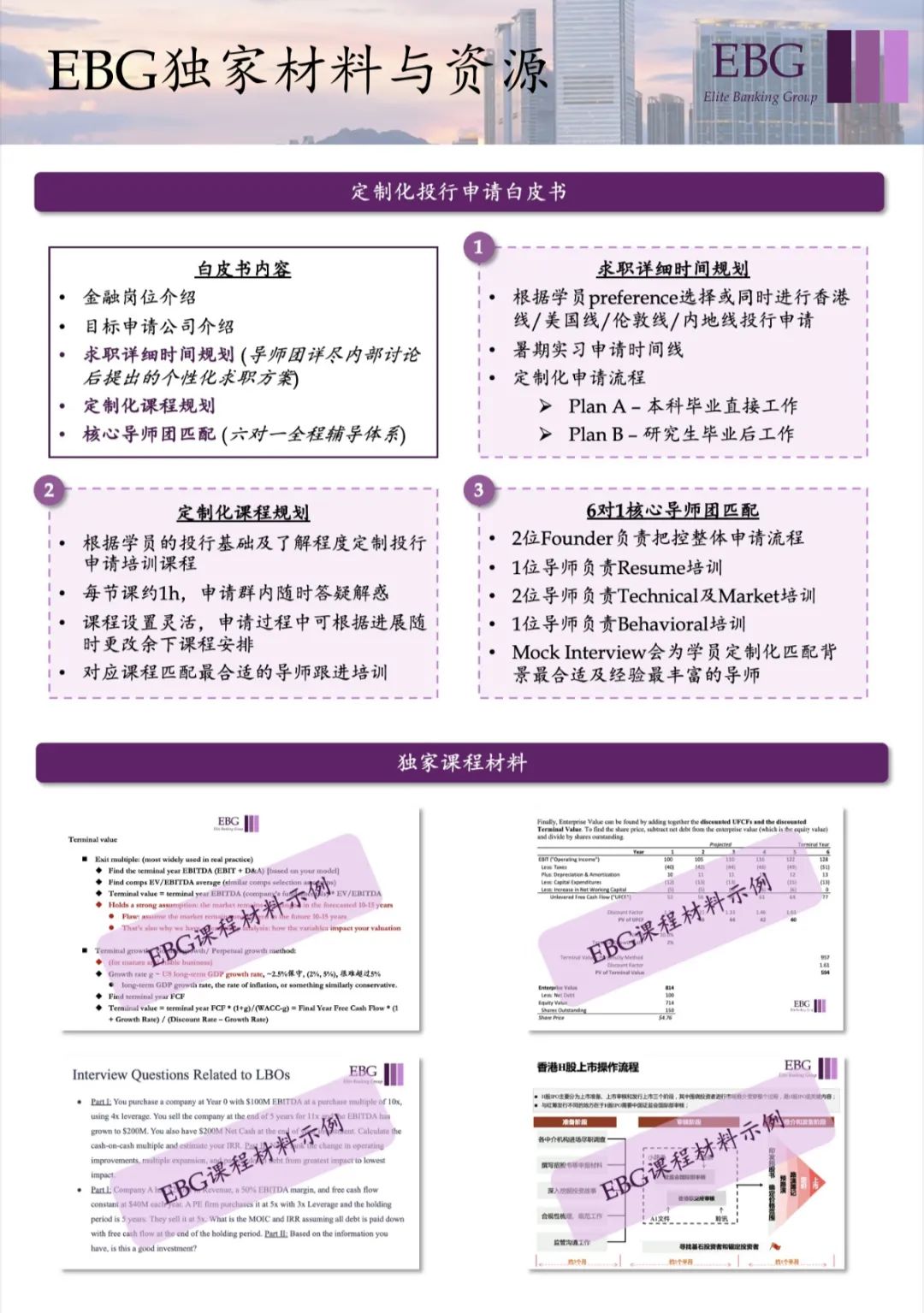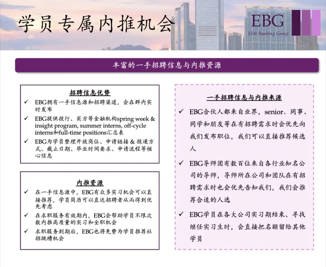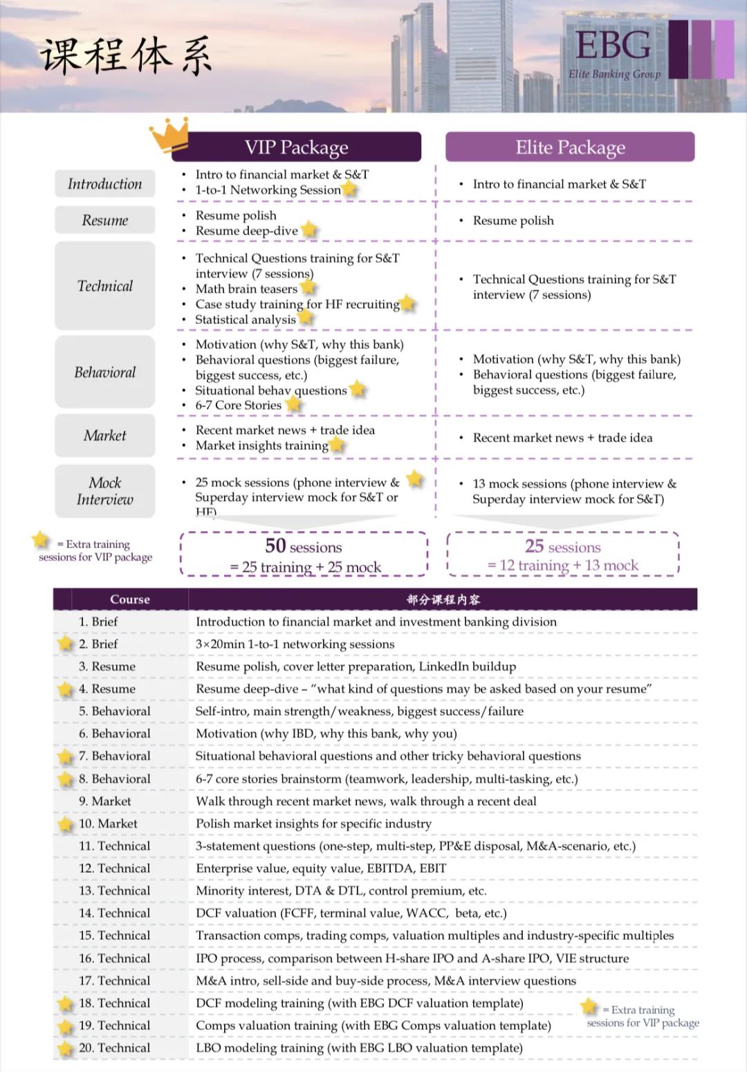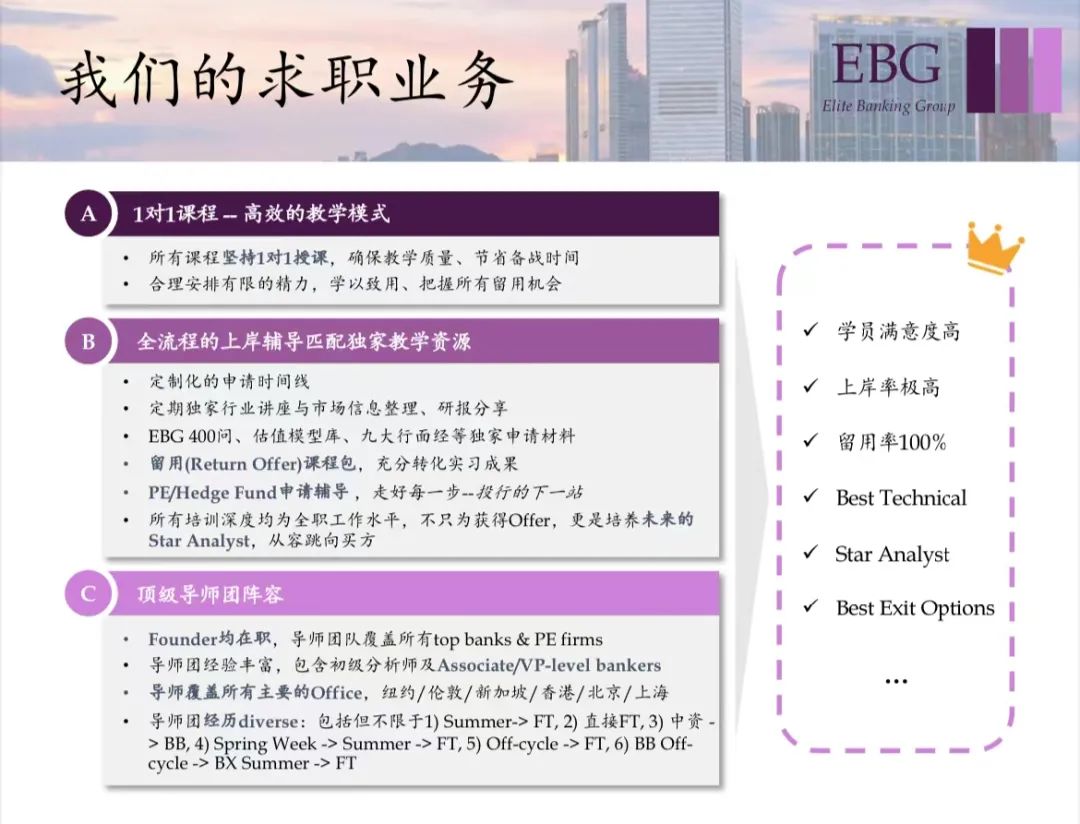 EBG 2024外资行VIP Program包含25节training与25节mock interview,均为1v1授课模式;同时提供最全外资中资行/Top Mega Fund申请面经与Case Study训练,无限次实习内推,以及岗位开放Application Tracker。