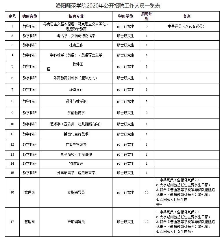 | 根据《河南省事业单位公开招聘工作规程》(豫人社〔2015〕55号)规定,我校拟面向社会招聘工作人员40名。结合我校实际,制定本招聘方案。 洛阳师范学院是一所具有104年办学历史的省属本科院校。2011年获批教育硕士专业学位研究生培养试点单位;2018年以优异成绩通过了教育部本科教学工作审核评估,专家组给予了学校“有活力、有品位、有温度、有颜值、有潜力”的评价;2020年入选河南省特色骨干学科建设高校。学校现有23个学院,73个本科专业,全日制在校生28000余人,学校占地2850亩,建筑面积近71万㎡。近年来,学校获批国家教学成果二等奖1项;入选国家级一流本科专业建设点2个;获批国家级虚拟仿真实验教学项目1项;学校2016年以来连续入选ESI数据库排行榜,化学学科ESI排名保持全球大学和科研机构前1%;获批河南省一级重点学科4个,二级重点学科4个;获批教育部国别与区域研究基地——意大利研究中心,国家重点研发计划——中意智慧城市合作研究室项目等。五年来,获批国家基金项目122项、省部级项目387项。学校成立由校党委书记、校长为组长,分管组织、人事、教务、科研工作的校领导为副组长,组织、人事、教务、科研和教学部门负责人组成的招聘工作领导小组。领导小组下设办公室,办公室设在人事处,具体负责招聘的组织、协调工作,纪委监察专员办公室全程监督。根据我校人员岗位空缺情况和发展需要,拟招聘40名工作人员。详见附件《洛阳师范学院2020年公开招聘工作人员一览表》。5.2018、2019、2020年毕业的普通高等教育硕士研究生(择业期内未落实工作单位的高校毕业生),第一学历为普通高等教育本科毕业并获得学士学位,本、硕所学专业一致或相近;国(境)外学历需取得教育部留学服务中心出具的国外学历学位认证书;6.岗位所需的专业和其他条件(详见附件《洛阳师范学院2020年公开招聘工作人员一览表》);7.根据工作需要,年龄限定为28岁以下(1992年1月1日以后出生);8.思想政治辅导员和思想政治教育、马克思主义基本原理、马克思主义中国化研究等专业专任教师须为中共党员(含预备党员),其中申报思想政治辅导员者须有学生干部经历;9.专任教师岗位人员到校工作后,须兼任辅导员或班主任工作二年。1.刑事处罚期限未满或者涉嫌违法犯罪正在接受调查的人员; 2.尚未解除党纪、政纪处分或正在接受纪律审查的人员;3.曾在公务员招录、事业单位公开招聘考试中被认定有舞弊等严重违反招聘纪律行为、5年内不得参加本省内各级事业单位公开招聘的人员;4.国家和河南省另有规定不得应聘到事业单位的人员。本招聘方案将在河南省教育厅备案,同时发布在河南招才引智创新发展大会官网(https://www.zghnrc.gov.cn/)、河南省人力资源和社会保障厅网站(网址http://hrss.henan.gov.cn/)和洛阳师范学院网站(网址http://www.lynu.edu.cn/),发布时间为2020年11月26日至2020年12月4日。报名采用网上报名方式,登录“洛阳师范学院教师招聘报名系统”报名(网址http://zhaopin.haedu.gov.cn/default.aspx?sid=23),报名时间为2020年11月30日至2020年12月4日。每人限报我校1个岗位,请应聘者慎重选报。报名成功后务必牢记登陆密码,应聘者可凭此密码登陆招聘系统查询个人相关信息。通过资格审查的应聘者在参加笔试前,须进行现场资格确认及资格核查,届时须提供的材料包括:2.本科、硕士研究生学历学位证书原件、教育部学历证书电子注册备案表及复印件各1份;3.留学回国人员需提供本人有效身份证件、留学回国人员证明及教育部出具的国外学历学位认证书等原件及复印件各1份;重要提示:上述材料审验原件,留复印件。招聘工作中具体事宜,请应聘人员随时关注我校网站(若本人不及时阅读相关信息,造成后果,责任自负)。报名和资格审查工作由我校人事处负责。资格审查贯穿招聘全过程,一旦查实应聘人员资格不符,随时取消应聘资格。应聘人员若需咨询,请直接与学校人事处联系。联系人:谷老师、张老师,联系电话:0379-68618061。考试包括笔试和面试,在河南省人力资源和社会保障厅、河南省教育厅指导下,由我校具体组织实施。1.笔试。笔试满分100分,笔试内容为应聘岗位所需的公共基础知识、职业能力基础知识和专业基础知识,主要测评应聘者适应岗位要求的知识水平和业务素质。笔试不指定考试范围和教材。笔试以闭卷方式进行,成绩及排名在笔试结束一周内在我校网站上公布。招聘岗位人数与通过资格审查人数未达到1:3比例的,相应递减招聘岗位人数,变动情况将及时在学校网站公布。笔试结束后,若某一岗位笔试人数不足3人,取消该岗位招聘。2.面试。面试满分100分。面试人选根据笔试成绩,按各岗位拟招聘人数职位1:3的比例从高分到低分确定(最后一名分数并列的共同进入面试)。面试按照应聘岗位类别分类进行:思想政治辅导员和管理岗位采取演讲、答辩形式;专任教师采取试讲、答辩(有特别要求的可增加实践操作环节、专业知识测试等)等方式进行。面试环节将全程录像。整场面试结束后,现场公布面试成绩,并于当天在学校人事处网页公布成绩及排名。面试当天若相关岗位人员缺考形不成竞争,取消该岗位招聘。若相关岗位人员缺考形成竞争,面试继续进行,成绩有效,未到场人员成绩视为零分。3.考试总成绩=笔试成绩×40%+面试成绩×60%。4. 疫情防控措施根据《洛阳师