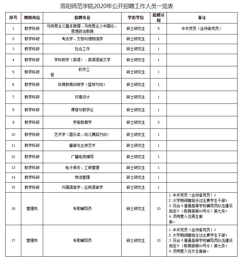 根据《河南省事业单位公开招聘工作规程》(豫人社〔2015〕55号)规定,我校拟面向社会招聘工作人员40名。结合我校实际,制定本招聘方案。 洛阳师范学院是一所具有104年办学历史的省属本科院校。2011年获批教育硕士专业学位研究生培养试点单位;2018年以优异成绩通过了教育部本科教学工作审核评估,专家组给予了学校“有活力、有品位、有温度、有颜值、有潜力”的评价;2020年入选河南省特色骨干学科建设高校。学校现有23个学院,73个本科专业,全日制在校生28000余人,学校占地2850亩,建筑面积近71万㎡。近年来,学校获批国家教学成果二等奖1项;入选国家级一流本科专业建设点2个;获批国家级虚拟仿真实验教学项目1项;学校2016年以来连续入选ESI数据库排行榜,化学学科ESI排名保持全球大学和科研机构前1%;获批河南省一级重点学科4个,二级重点学科4个;获批教育部国别与区域研究基地——意大利研究中心,国家重点研发计划——中意智慧城市合作研究室项目等。五年来,获批国家基金项目122项、省部级项目387项。学校成立由校党委书记、校长为组长,分管组织、人事、教务、科研工作的校领导为副组长,组织、人事、教务、科研和教学部门负责人组成的招聘工作领导小组。领导小组下设办公室,办公室设在人事处,具体负责招聘的组织、协调工作,纪委监察专员办公室全程监督。根据我校人员岗位空缺情况和发展需要,拟招聘40名工作人员。详见附件《洛阳师范学院2020年公开招聘工作人员一览表》。5.2018、2019、2020年毕业的普通高等教育硕士研究生(择业期内未落实工作单位的高校毕业生),第一学历为普通高等教育本科毕业并获得学士学位,本、硕所学专业一致或相近;国(境)外学历需取得教育部留学服务中心出具的国外学历学位认证书;6.岗位所需的专业和其他条件(详见附件《洛阳师范学院2020年公开招聘工作人员一览表》);7.根据工作需要,年龄限定为28岁以下(1992年1月1日以后出生);8.思想政治辅导员和思想政治教育、马克思主义基本原理、马克思主义中国化研究等专业专任教师须为中共党员(含预备党员),其中申报思想政治辅导员者须有学生干部经历;9.专任教师岗位人员到校工作后,须兼任辅导员或班主任工作二年。1.刑事处罚期限未满或者涉嫌违法犯罪正在接受调查的人员; 2.尚未解除党纪、政纪处分或正在接受纪律审查的人员;3.曾在公务员招录、事业单位公开招聘考试中被认定有舞弊等严重违反招聘纪律行为、5年内不得参加本省内各级事业单位公开招聘的人员;4.国家和河南省另有规定不得应聘到事业单位的人员。本招聘方案将在河南省教育厅备案,同时发布在河南招才引智创新发展大会官网(https://www.zghnrc.gov.cn/)、河南省人力资源和社会保障厅网站(网址http://hrss.henan.gov.cn/)和洛阳师范学院网站(网址http://www.lynu.edu.cn/),发布时间为2020年11月26日至2020年12月4日。报名采用网上报名方式,登录“洛阳师范学院教师招聘报名系统”报名(网址http://zhaopin.haedu.gov.cn/default.aspx?sid=23),报名时间为2020年11月30日至2020年12月4日。每人限报我校1个岗位,请应聘者慎重选报。报名成功后务必牢记登陆密码,应聘者可凭此密码登陆招聘系统查询个人相关信息。通过资格审查的应聘者在参加笔试前,须进行现场资格确认及资格核查,届时须提供的材料包括:2.本科、硕士研究生学历学位证书原件、教育部学历证书电子注册备案表及复印件各1份;3.留学回国人员需提供本人有效身份证件、留学回国人员证明及教育部出具的国外学历学位认证书等原件及复印件各1份;重要提示:上述材料审验原件,留复印件。招聘工作中具体事宜,请应聘人员随时关注我校网站(若本人不及时阅读相关信息,造成后果,责任自负)。报名和资格审查工作由我校人事处负责。资格审查贯穿招聘全过程,一旦查实应聘人员资格不符,随时取消应聘资格。应聘人员若需咨询,请直接与学校人事处联系。联系人:谷老师、张老师,联系电话:0379-68618061。考试包括笔试和面试,在河南省人力资源和社会保障厅、河南省教育厅指导下,由我校具体组织实施。1.笔试。笔试满分100分,笔试内容为应聘岗位所需的公共基础知识、职业能力基础知识和专业基础知识,主要测评应聘者适应岗位要求的知识水平和业务素质。笔试不指定考试范围和教材。笔试以闭卷方式进行,成绩及排名在笔试结束一周内在我校网站上公布。招聘岗位人数与通过资格审查人数未达到1:3比例的,相应递减招聘岗位人数,变动情况将及时在学校网站公布。笔试结束后,若某一岗位笔试人数不足3人,取消该岗位招聘。2.面试。面试满分100分。面试人选根据笔试成绩,按各岗位拟招聘人数职位1:3的比例从高分到低分确定(最后一名分数并列的共同进入面试)。面试按照应聘岗位类别分类进行:思想政治辅导员和管理岗位采取演讲、答辩形式;专任教师采取试讲、答辩(有特别要求的可增加实践操作环节、专业知识测试等)等方式进行。面试环节将全程录像。整场面试结束后,现场公布面试成绩,并于当天在学校人事处网页公布成绩及排名。面试当天若相关岗位人员缺考形不成竞争,取消该岗位招聘。若相关岗位人员缺考形成竞争,面试继续进行,成绩有效,未到场人员成绩视为零分。3.考试总成绩=笔试成绩×40%+面试成绩×60%。4. 疫情防控措施根据《洛阳师