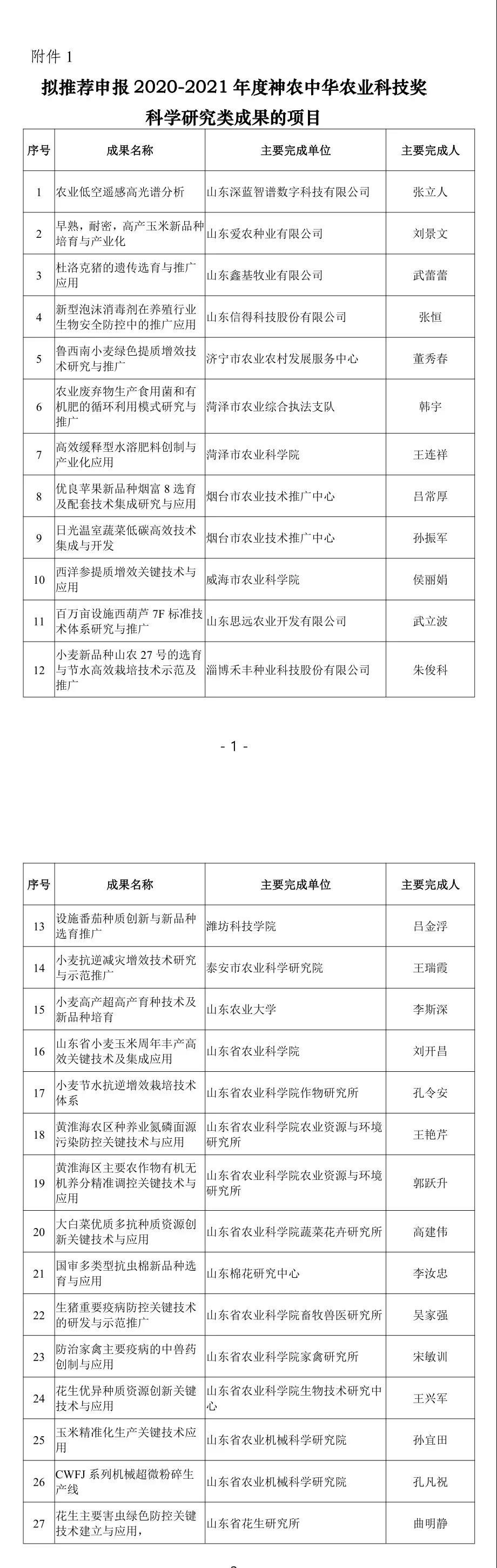 | 关于拟推荐申报2020-2021年度神农中华农业科技奖项目的公示 根据中国农学会《关于2020-2021年度神农中华农业科技奖推荐工作的通知》,拟推荐38个项目申报神农中华农业科技奖科学研究类成果、3个项目申报神农中华农业科技奖科学普及类成果、2个团队申报优秀创新团队类成果,现予公示。公示时间为5个工作日(2020年12月21日—2020年12月25日),公示期内如有异议,请向省农业农村厅科教处反映。联系电话:0531-67866137。 山东省农业农村厅 2020年12月21日