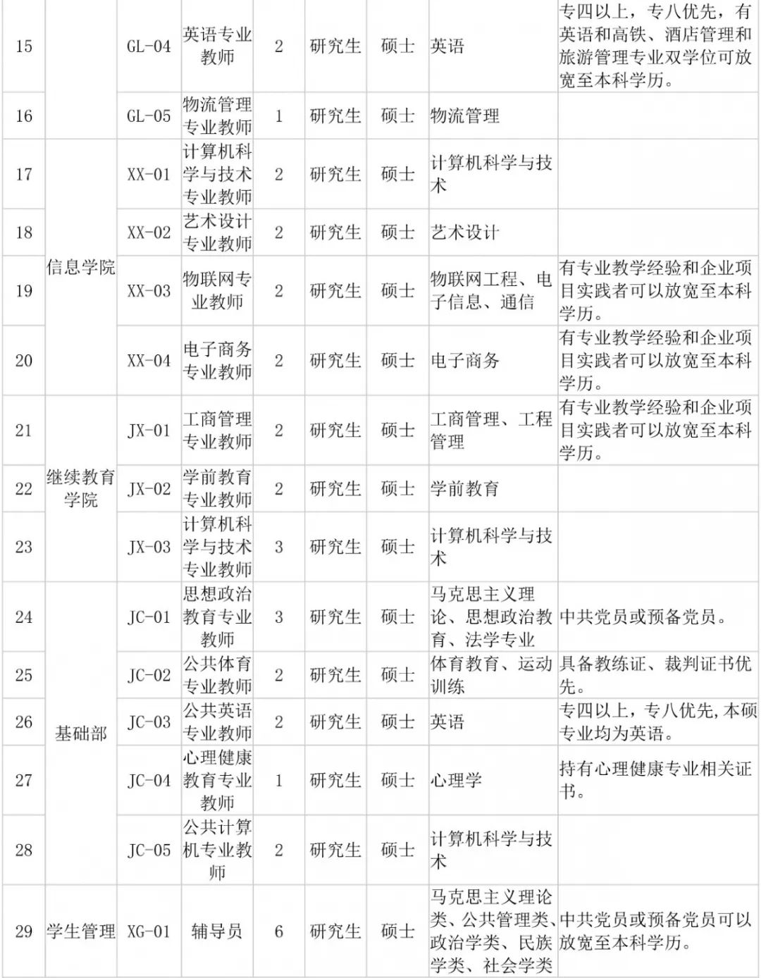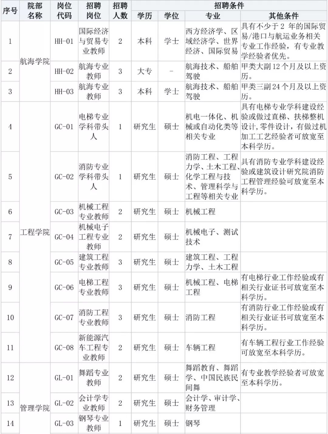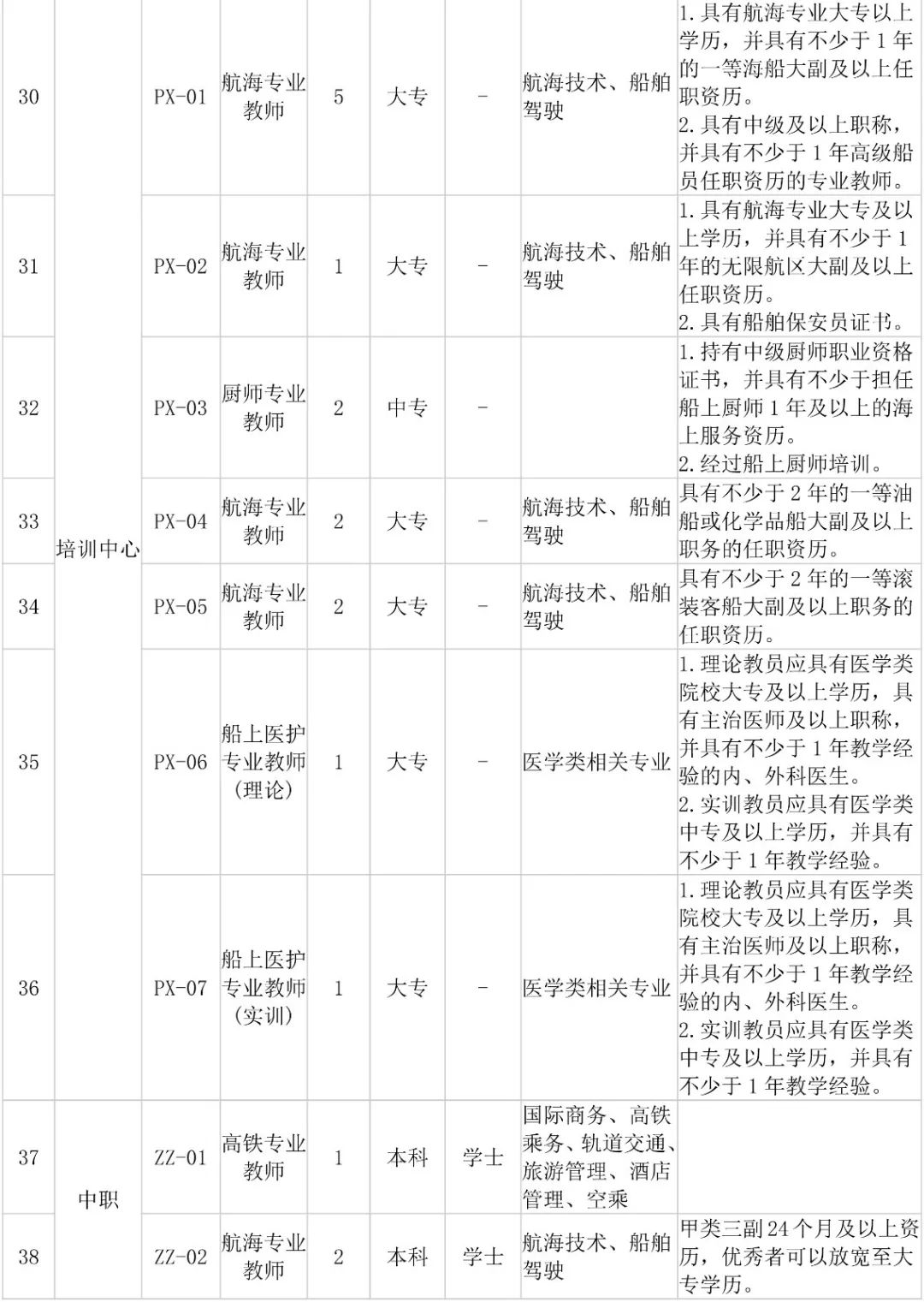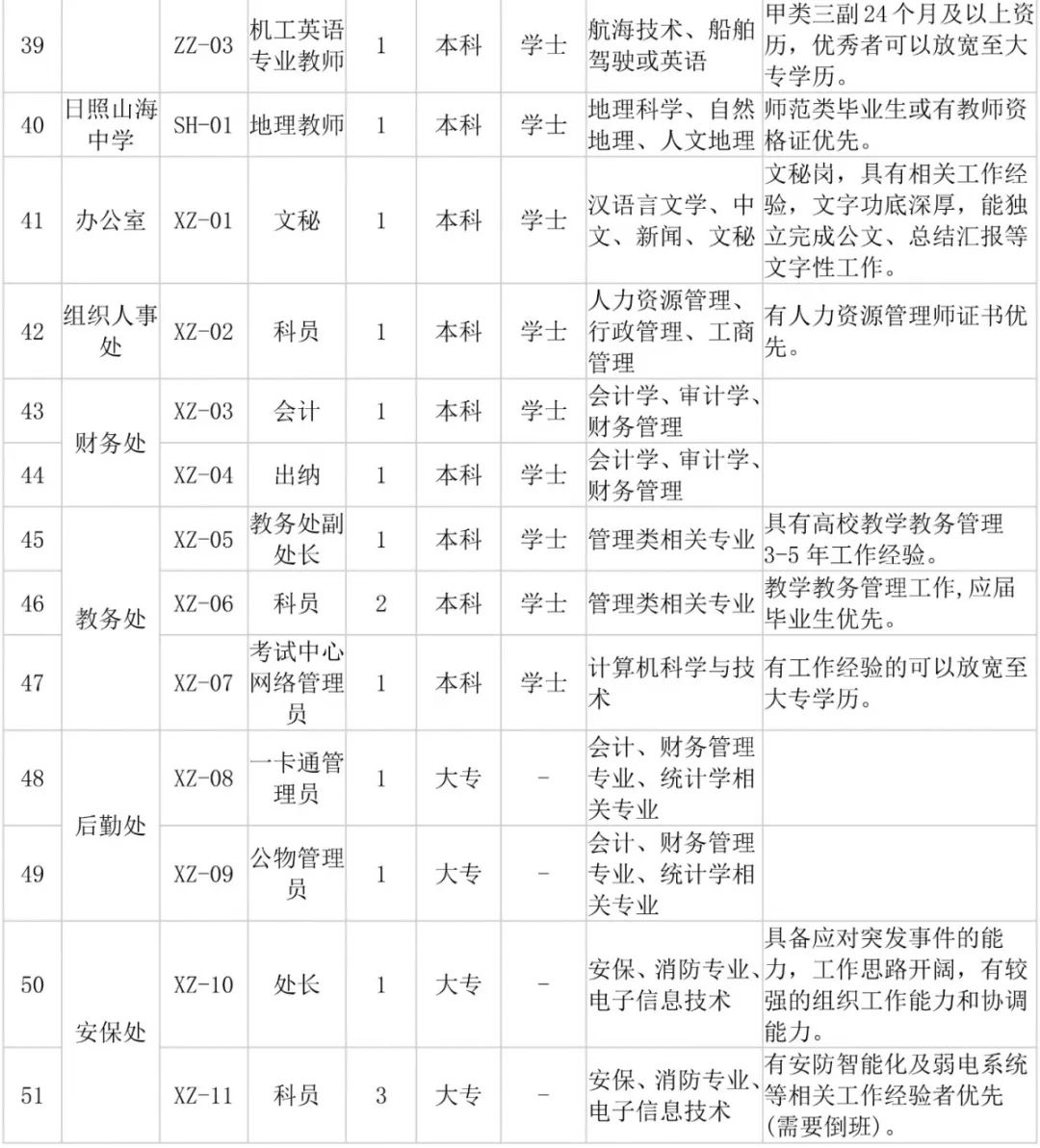 一、学校简介 日照航海工程职业学院(Rizhao Marine Engineering Vocational College)是经山东省人民政府批准,并在教育部备案的全日制普通高等专科学校,实行省市两级管理、以日照市为主的管理体制,是山东省首批12所高职教育综合评价招生试点院校和单独招生院校之一,是山东省校企合作(产教融合)示范单位。专业发展到15个,建成5个基础实训室、2个国家海事局达标考试中心、49个航海专业实训室、3个校内实训中心、20多个校外实训基地,拥有国内领先水平的 360°全视景航海模拟器、轮机模拟器,智能电梯工程实训与鉴定中心、豪华邮轮仿真实训中心列入山东省高校基础能力建设工程,消防学院的建设与发展路径列入日照市“创新种子项目”,正加快建设特色鲜明、优质一流的高等职业院校。 二、招聘岗位信息表 三、薪酬待遇 (一)学院与录用人员签订劳动合同,享受学院规定的薪酬待遇并为教职工办理国家规定的社会保险。 (二)符合学院专任教师专业技术职务聘任条件的,可聘任相关专业技术职务(专任教师专业技术职务系列:助教、讲师、副教授、教授)。 四、应聘须知 (一)请应聘者于报名截止之日前将个人简历,本科和研究生阶段的学历学位证书(应届毕业生提供就业推荐表、学习成绩单、取得境外学历学位证书报名者应提供教育部留学服务中心出具的学历学位认证书)、身份证、职称证书、高校教师资格证书(若有)等与岗位条件相关的证明材料发送到邮箱:rzmevchr@163.com(邮件主题请按如下格式:姓名+岗位代码+应聘岗位名称)。 (二)报名时间:即日起至2020年2月28日。 (三)招聘流程:组织人事处接收应聘者资料。用人部门完成报名资格审查。组织人事处提交院长办公会,研究确定符合报名资格人员名单。用人部门组织完成试讲及面试考核。组织人事处提交院长办公会,研究确定拟聘用人员名单。公示及体检结果不影响入职的,组织人事处通知其办理入职手续。 五、联系方式 (一)地址:山东省日照市山海路369号【日照航海工程职业学院】组织人事处 (二)网址:http://www.rzmevc.com (三)联系人:张老师/崔老师/李老师 联系电话:0633-8672016 |