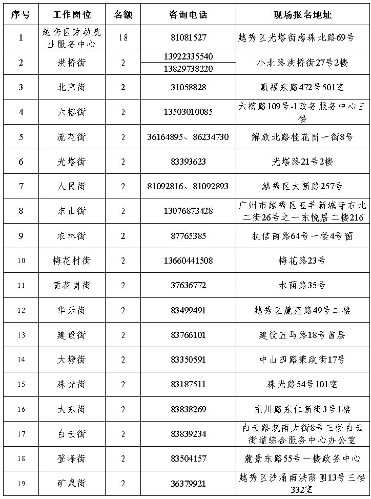 广州市越秀区2022年度高校毕业生基层公共就业创业服务岗位公开招聘公告 根据《广州市人力资源和社会保障局关于转发〈广东省高校毕业生基层公共就业创业服务岗位招募管理办法〉的通知》(穗人社函〔2022〕323 号,以下简称《通知》)有关要求,广州市越秀区人力资源和社会保障局面向社会公开招聘54名高校毕业生基层公共就业创业服务工作人员。现将有关事项公告如下: 一、招聘岗位及职责 (一)招聘岗位:广州市越秀区人力资源和社会保障局共招聘54名,安排在属下单位及越秀区内街道公共就业服务机构从事公共就业创业服务岗位,工作岗位名额、报名联系人、地址、咨询电话详见下表: