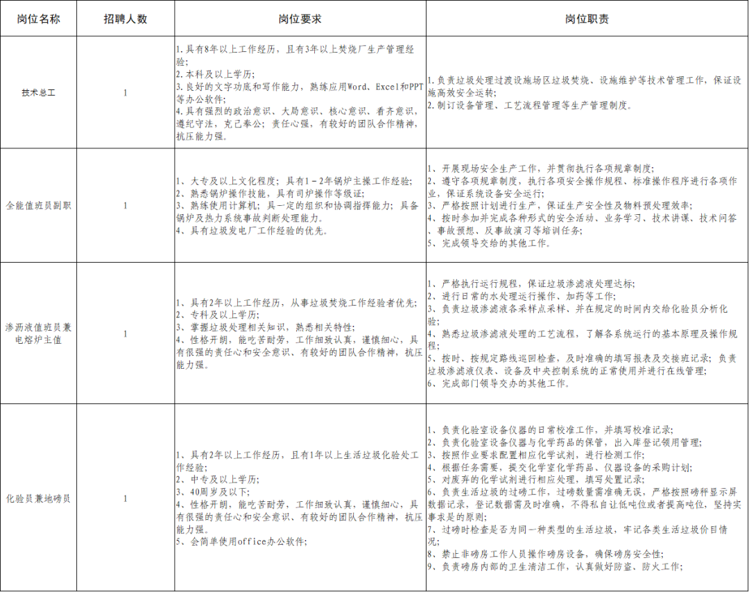 | 河北雄安人力资源服务有限公司(以下简称雄安人力公司)根据生态建设公司垃圾处理过渡设施工作需要,现面向社会公开招聘技术管理和运行操作人员。本次招聘人员工作地点在雄安新区雄县,负责垃圾处理的技术、设施维护等管理工作和生活垃圾过磅、焚烧、渗滤液处理和化验等相关工作。 一、招聘原则 坚持德才兼备、以德为先、五湖四海、任人唯贤的用人标准,坚持公开、平等、竞争、择优的用人原则。 二、招聘岗位 招聘人数4人。 招聘岗位及岗位要求详见附件或招聘报名页面。 (请点击链接查看详情) http://www.xiongan.gov.cn/2022-10/21/1211694043_16663147372981n.png 三、报名时间及方式 1.报名截止时间:自公告发布之日起至招满为止。 2.报名方式:本次招聘报名仅接受网上报名。应聘人员登录雄才网(网址:www.ixahr.com)进行报名。 四、人员管理及有关待遇 聘用人员与雄安人力公司签订劳动合同,办理手续后安排到相应岗位工作。 五、注意事项 1.应聘人员须同时附件提交身份信息、毕业证书、岗位要求的资格证书等相关证明材料。 2.应聘人员应对本人填报、提供信息的真实性、准确性、完整性负责;提供虚假信息者,一经发现,取消应聘资格。 3.应聘人员投递简历时只可选择该甲方公司其中一个岗位,不可重复投递。 4.招聘有关信息将通过短信、电话或邮件等方式通知,招聘各环节未通过人员不再另行通知。请应聘者确保填报的手机号码、邮箱等联系方式准确无误,并保持通讯畅通。 5.招聘不收取任何费用,不举办或委托任何机构开展相关辅导培训。 六、报名咨询 1.咨询电话:0312-5619956,0312-5619961 2.咨询时间:9:00-12:00,14:00-17:30(工作日) 报名入口:(请复制以下网址到浏览器中查看)https://www.ixahr.com/index.php?m=&c=jobs&a=com_show&id=195 河北雄安人力资源服务有限公司 信息来源于网络,如有变更请以原发布者为准。 来源链接: http://www.xiongan.gov.cn/2022-10/21/c_1211694043.htm |