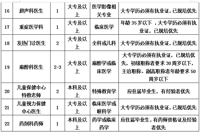 阳春市妇幼保健院2022年面向社会公开招聘工作人员公告 现因医院业务发展需要,按照公开、平等、竞争、择优的原则,拟面向社会招聘各类人才32名。现将有关招聘事项公告如下: 招聘岗位及资格条件 01基本条件 政治思想好,诚实守信,遵纪守法,无违法违纪记录,身体健康,有胜任应聘岗位需要的相关专业知识和工作能力。 02招聘岗位、人数及要求