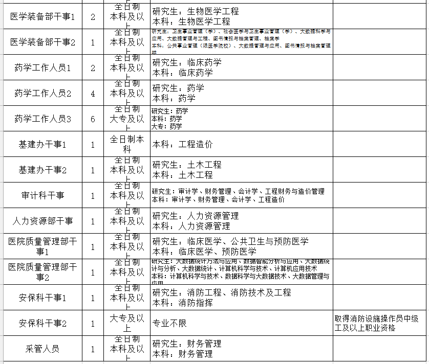 注意事项:上传资料须清晰可辨,两种报名方式任选其一,每人限报一个岗位,多报、错报、误报、重复报名、未按规定格式及要求报名、报名资料模糊或不齐全、未在规定时间内报名均作资格不合格处理,责任由报名人员自负。 3.报名后请保持手机畅通并自行留意医院官网,关注后续相关通知信息。 (二)资格审查 资格审查贯穿招聘和管理始终。报名者提交的信息和提供的有关资料必须真实有效。以本人学籍档案、官方网站备案查询和毕业时取得的有效学位证及毕业证所载信息为验证依据。对弄虚作假、证件和资料不实且不符合规定资格条件的,一经查实取消其招聘资格。 (三)考试 1.硕士研究生及以上学历学位人员仅进行面试,满分100分,面试成绩即为总成绩。其余人员进行笔试和面试,笔试、面试满分均为100分,按各占50%的比例计算总成绩。 2.资格审查合格人员须按医院要求准时参加考试,否则视为自动放弃。考试时间另行通知。 3.面试成绩低于75分的不作为拟招聘人员。 (四)体检 1.体检人员确定 根据招聘名额,按照报考者总成绩,从高分到低分依次等额确定体检人员。如考试总成绩相同,按面试成绩从高到低确定体检人员。 2.体检标准 体检的项目和标准参照修订后的《公务员录用体检通用标准(试行)》及《公务员录用体检操作手册(试行)》执行,费用自理。 3.体检时间 体检时间另行通知。 (五)公示和招聘 体检合格者确定为拟招聘人员,并在巴中市中心医院官网公示5个工作日。经公示期满无异议的人员,按规定权限和程序办理相关招聘手续。 三、待遇和管理 (一)解决员额编制。 (二)临床医技科室一线人员按医院有关规定,全日制博士研究生补助20万元安家补助费,正高级专业技术人员补助15万元安家补助费,全日制硕士研究生或副高级专业技术人员补助8万元安家补助费,具有国(境)外连续一年及以上相关工作或学习经历的再增加5万元。 (三)根据《关于贯彻落实住院医师规范化培训“两个同等对待”政策的通知》(川卫科教函[2022]91号),“面向社会招收的住院医师如为普通高校应届毕业生的,其住培合格当年在医疗卫生机构就业,按当年应届毕业生同等对待”“经住培合格的本科学历临床医师,工资待遇按临床医学、口腔医学、中医专业学位硕士研究生同等对待”。 四、纪律与监督 我院在本次招聘中,将确保信息、过程、结果公开,接受社会及有关部门的监督。对违反规定、弄虚作假招聘的人员一经查实,取消其招聘资格,并对相关人员按照有关规定进行严肃处理。构成犯罪的,依法追究刑事责任。 最终解释权归巴中市中心医院人力资源部。 咨询电话:伍老师 0827-5201310。 附件:招聘岗位一览表